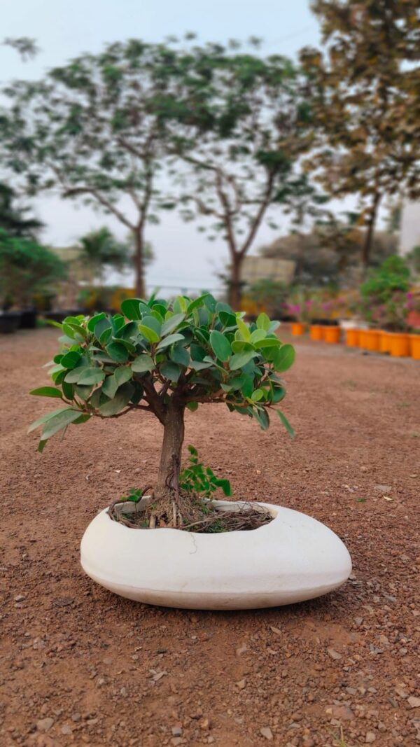 This Ficus Microcarpa Goldcoin Bonsai has a good canopy and branch structure. It Comes in 8 inches beautiful handmade bonsai pot with a natural rock to give it an aesthetic landscape appeal.