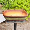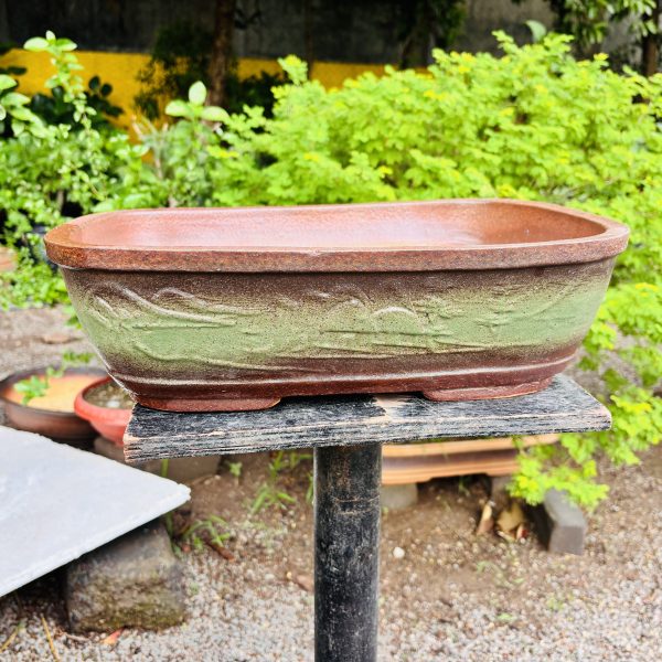 EarthenRoot™ 15.5-Inch Rectangular Carved Bonsai Tray – Dual-Tone Green & Brown Ceramic for Natural Bonsai Compositions